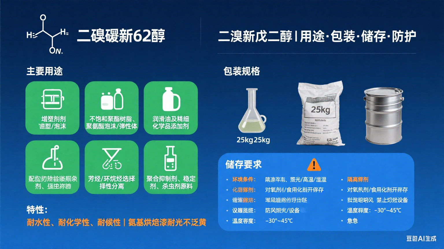 二溴新戊二醇被廣泛用作增塑劑,用于生產(chǎn)不飽和聚酯樹(shù)脂、無(wú)油醇酸樹(shù)脂、聚氨酯泡沫和彈性體,是良好潤(rùn)滑油和其他精細(xì)化學(xué)品的添加劑。新戊二醇是一種優(yōu)良的溶劑,可用于芳烴和環(huán)烷烴的選擇性分離。新戊二醇具有耐水性、耐化學(xué)性和耐候性。氨基烘焙漆具有良好的耐光性,不會(huì)變黃。它也可以用作生產(chǎn)聚合抑制劑、穩(wěn)定劑和殺蟲(chóng)劑的原料。
