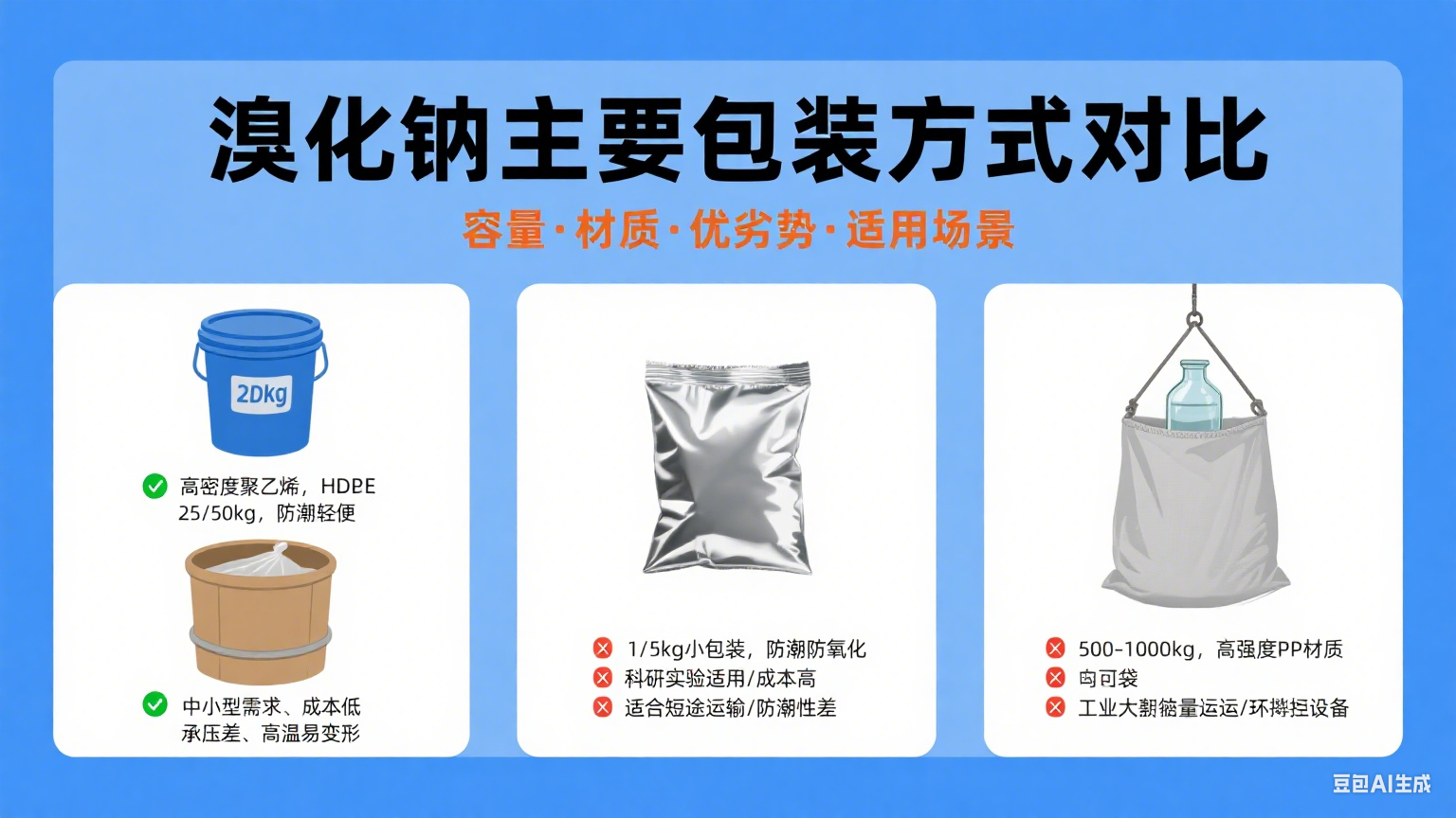 玻璃瓶或塑料瓶包裝主要用于科研領域的小劑量溴化鈉,瓶裝產品通常容量在100g至500g之間。這類包裝注重密封性和使用便利性,多采用防潮、防氧化設計。